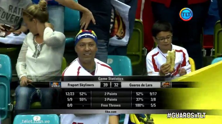 Los tiros libres de Gregory Echenique, que terminó el primer tiempo con ocho puntos, fueron el sustento ofensivo de Guaros a falta del acierto en juego en unos minutos de numerosas alternativas en el marcador. Las pérdidas en ataques de Guaros y las consecuentes transiciones de Fraport puso a los alemanes con ventaja ante un desdibujado Guaros. Un triple final de Heisler Guillent en el último ataque de la primera parte rompió un parcial alemán de 11-0 y dejó el marcador al descanso en 39-32 a favor del Fraport Skyliners.