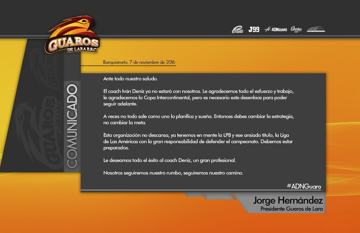 El equipo de Barquisimeto hizo oficial la salida del entrenador canario en un comunicado de su propietario Jorge Hernández, donde no anunció quien será el sustituto.