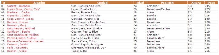 El entrenador Allans Colón tendrá a su disposición un plantel con mezcla de veteranía con jugadores como Carlos Arroyo, Miguel Alí Berdiel, Ricky Meléndez, Ansel Guzmán o Luis Villafañe y la juventud de otros como DeJuan Marrero o un Jared Ruiz, que tuvo un gran rendimiento en El Salvador con Halcones de Sonzacate y siendo el máximo anotador de la pasada Liga Centroamericana de Clubes.