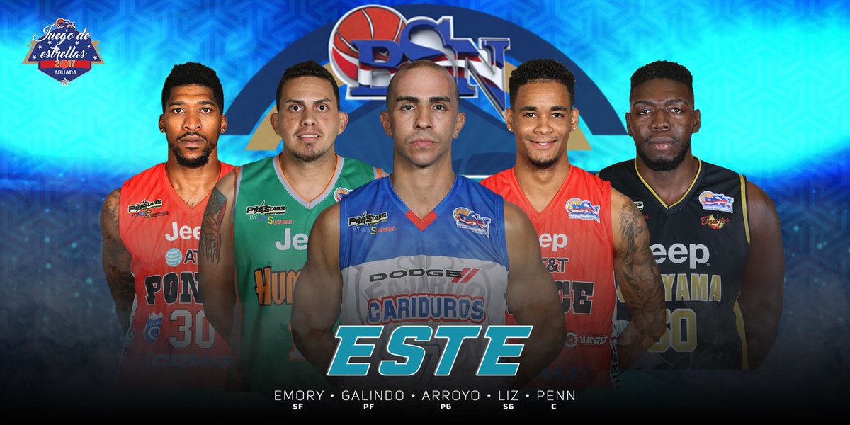 El Este será liderado por el armador Carlos Arroyo de los Cariduros de Fajardo que terminó como el líder en votos recibidos con un total de 8,832. Acompañando a Arroyo estará el escolta Víctor Liz de los Leones de Ponce con 4,787 votos y el alero será Carlos Emory que también milita con Ponce y recibió 2,252 votos. El delantero del equipo es el veterano Alex Galindo de los Caciques de Humacao que obtuvo 3,669 votos y el pívot es Kleon Penn de los Brujos de Guayama que recibió 2,605 votos.