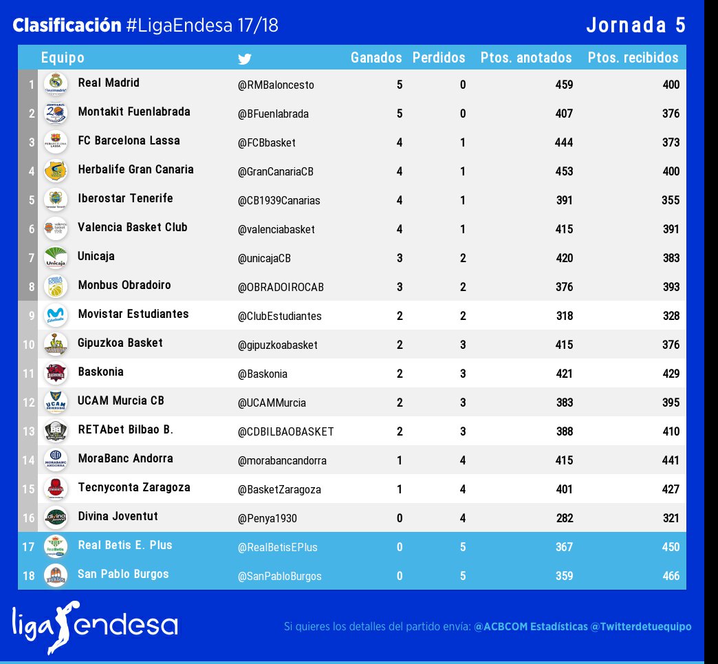 La jornada 5 de la Liga Endesa redujo el número de invictos de tres a dos tras la derrota del FC Barcelona y las victorias de Madrid y Fuenlabrada, el duelo de bahíenses fue para Nico Richotti, Patricio Garino debutó con Baskonia y el Granca de Eulis Báez sumó un nuevo triunfo.