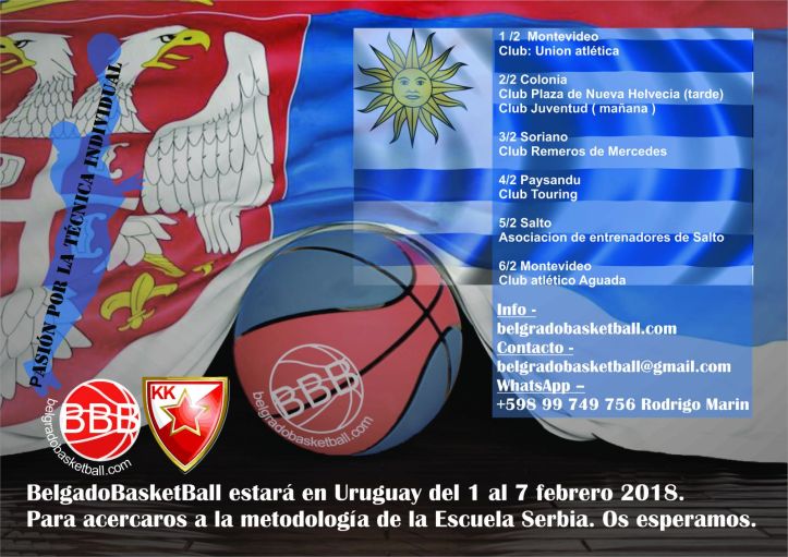 URUGUAY (1-7 de febrero): La gira por el país charrúa dará a conocer la metodología del entrenamiento del baloncesto serbio y se realizarán charlas y entrenamientos varios ciudades de la mano de Jordi Sampietro y Rodrigo Marín, responsable del Belgrado BasketBall en Uruguay: