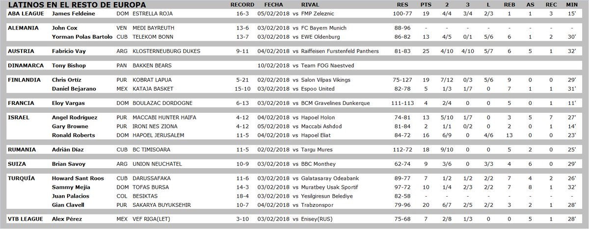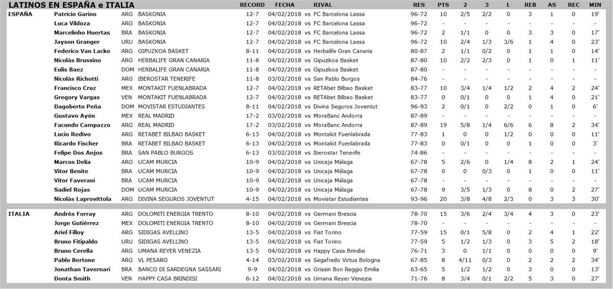 - (Ala-pívot) FABRICIO VAY: 25 puntos, 6 rebotes y 5 asistencias en la derrota de Klosterneuburg ante Furstenfeld por 83-81 (Austria)