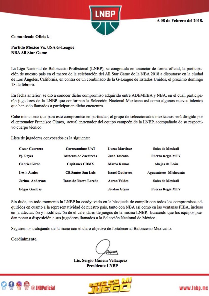 El partido será el próximo 18 de febrero y el combinado mexicano contará con la siguiente lista de jugadores para el evento: Juan Toscano, Jordan Glynn, Cézar Guerrero, PJ Reyes, Gabriel Girón, Irwin Ávalos, Jerime Anderson, Edgar Garibay, Luke Martinez, Marco Ramos, Israel Gutiérrez y Aaron Valdés