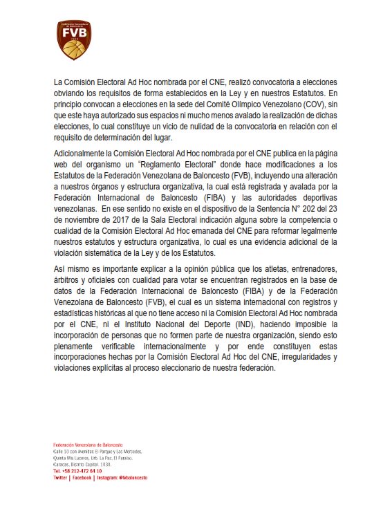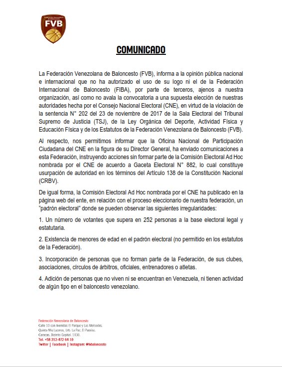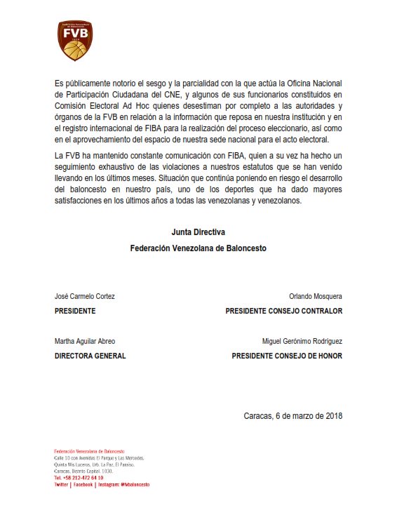 La Federación Venezolana de Baloncesto ha emitido un comunicado en referencia a la convocatoria de elecciones realizada por el CNE para el próximo 14 de abril.