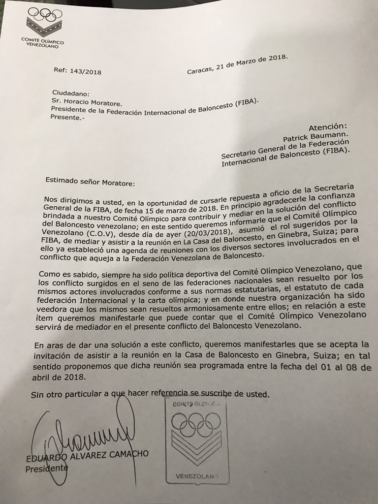 «Le agradecemos la confianza brindada a nuestro Comité Olímpico para contribuir y mediar en la solución del conflicto del baloncesto venezolano», explica el comunicado. «El COV asumió el rol sugerido por FIBA y ya estableció una agenda de reuniones con los diversos sectores involucrados en el conflicto que aqueja a la FVB»