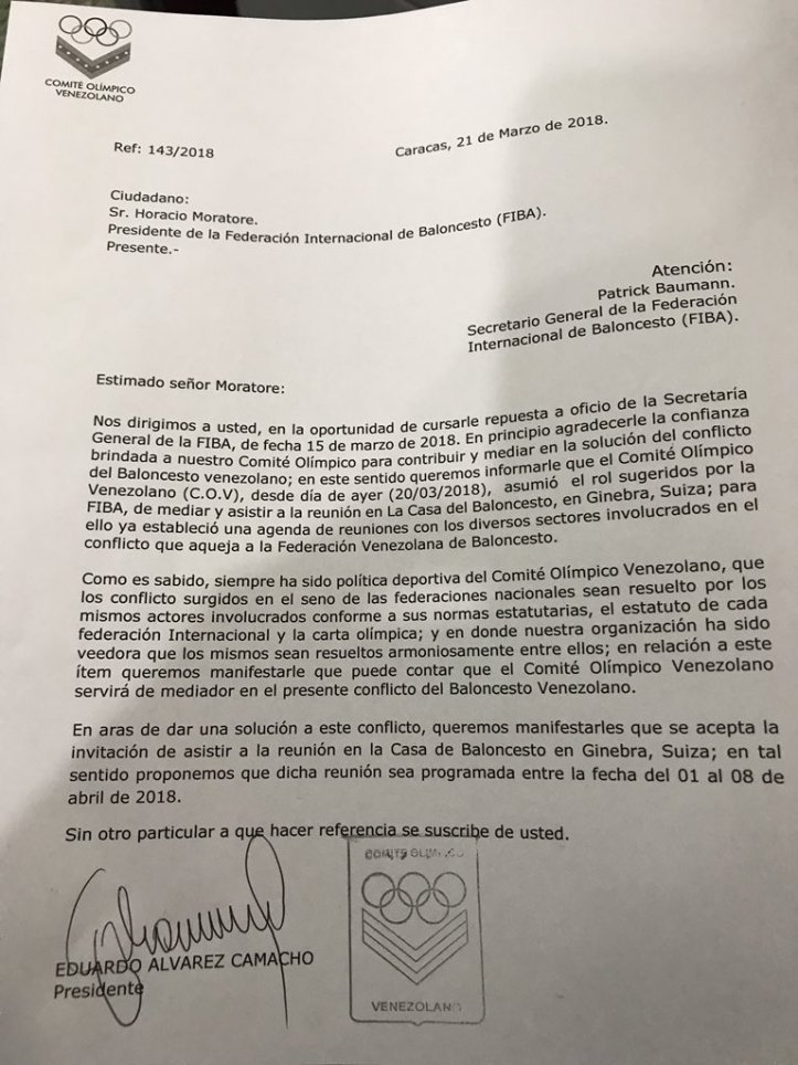 Ante la posibilidad de suspensión de la federación venezolana por «la interferencia de terceros» en el proceso eleccionario y ante la falta de un lugar común de diálogo entre la actual directiva y el movimiento Somos Baloncesto, ha sido el Comité Olímpico Venezolano el que se ha ofrecido como ente mediador y su presidente Eduardo Álvarez lo ha hecho público con una carta enviada a Patrick Baumann, secreatario general de la FIBA.