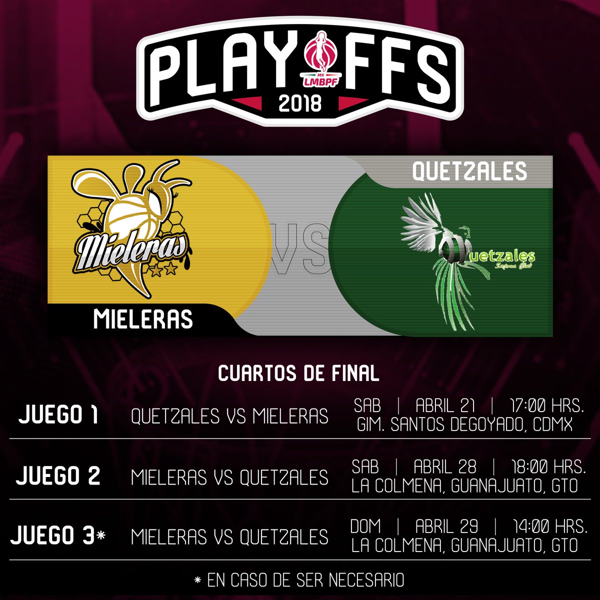Comienza la parte más emocionante de la temporada, los Playoffs 2018 que abren este sábado 21 de abril con dos series de cuartos de final Mieleras vs Quetzales y Aztks vs Reinas. Otras dos series, Lobas vs Acereras y Gamos vs Mexcaltecas, han devuelto a Lobas y Gamos como invitados a la etapa de semifinales.