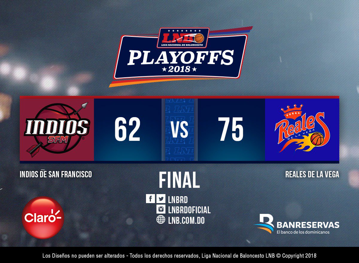 Los Reales de la Vega pasaron a comandar la serie final del circuito Norte tras vencer 75-62 a los Indios de San Francisco en un partido que se vio empañado por un mayúsculo incidente entre fanáticos de ambos equipos.