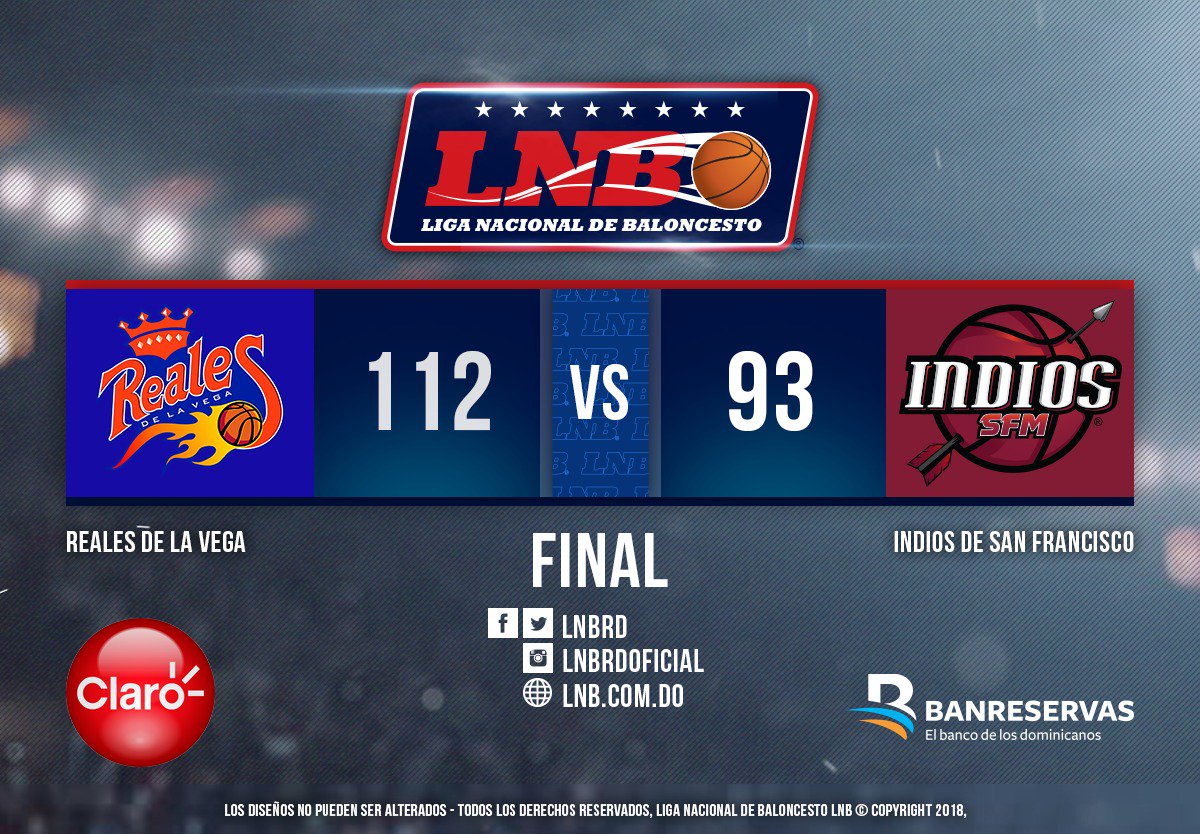 Los Reales de La Vega vencieron anoche 112-93 a los Indios de San Francisco para conseguir su pase a la Gran Final de la Liga Nacional de Baloncesto (LNB), en el partido que celebraron en el polideportivo Fernando Teruel de la Ciudad Olímpica de La Vega.