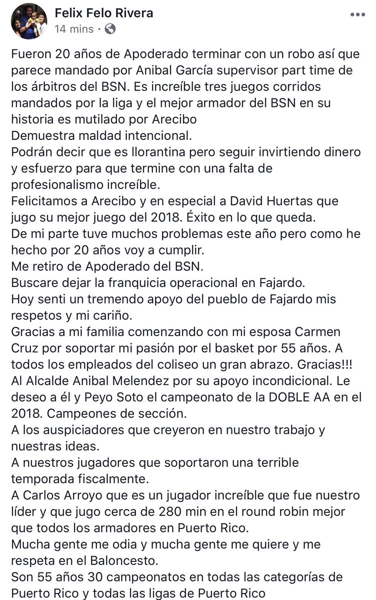 «Fueron 20 años de apoderado para terminar con un robo así. Podrán decir que es llorantina pero seguir invirtiendo dinero y esfuerzo para que termine con una falta de profesionalismo increíble», explicaba Felo en su cuenta de Facebook. «De mi parte tuve muchos problemas este año pero como he hecho por 20 años voy a cumplir. Me retiro de apoderado del BSN. Buscaré dejar la franquicia operacional en Fajardo. Hoy sentí un tremendo apoyo del pueblo de Fajardo. Mucha gente me odia y mucha gente me quiere y me respeta en el baloncesto»