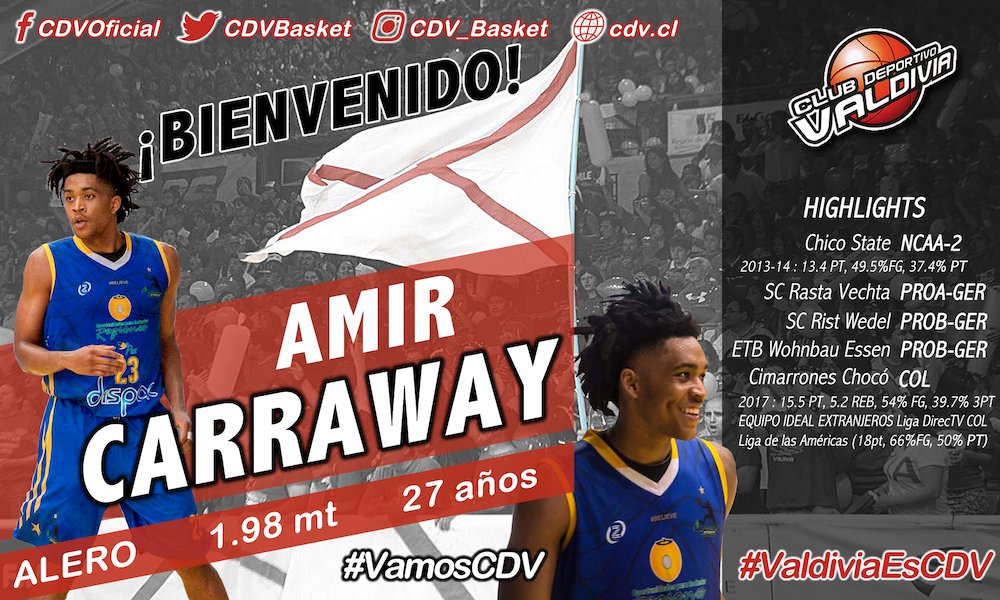 Amir Carraway es la segunda ficha extranjera de Valdivia. Este alero de 1.98 y 27 años, viene de defender al campeón colombiano Cimarrones de Chocó. En la campaña 2017 fue el máximo anotador con 16,4 por partido, 5,5 asistencias, 3 asistencias y 1,5 robos en 26 juegos. En esa etapa del torneo fue clave con su capacidad atlética y potencia anotadora en el quinteto que se quedó con la tercera posición del torneo.