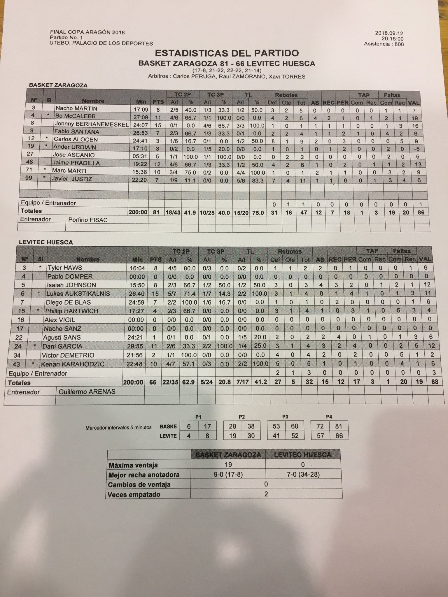 66 – Levitec Huesca (8+22+22+14): García (11), Aukstikalnis (15), Haws (8), Karahodzic (10), Hartwich (4) –cinco inicial– Sans (1), Demetrio (2), Karahodzic (10).