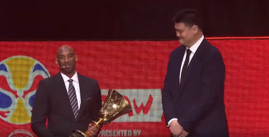 - Aparece Son of Dreams, la mascota del Mundial. Posteriormente entra en escena Yang Chaoyue, cantante del grupo Rock Girl 101, y ahora es turno para un vídeo con diversos momentos de la historia de los mundiales para dar paso a «una nueva era en el baloncesto». Gran ovación para el ídolo nacional Yao Ming, pero mayor aún para Kobe Bryant, que entrega el trofeo James Naismith a Yao.
