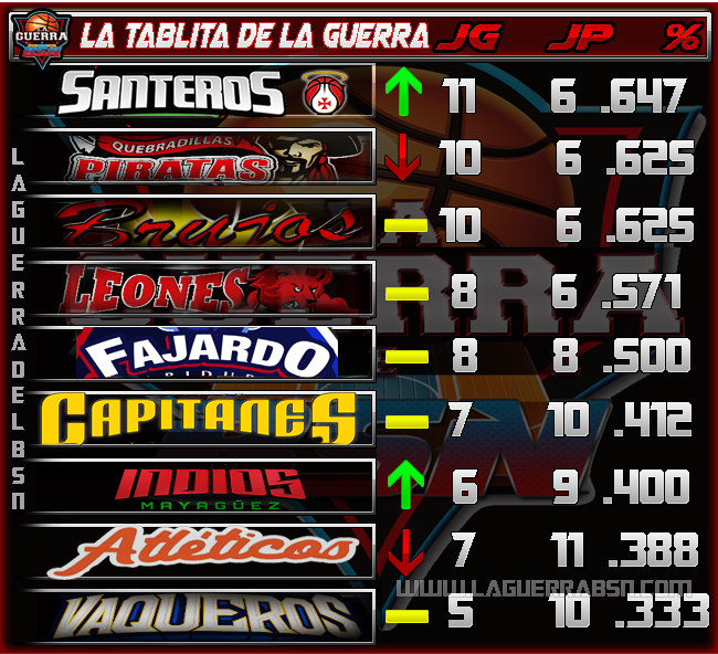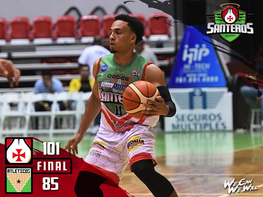 Santeros de Aguada se encuentra primero con récord de 11-6 luego de dominar a los Atléticos de San Germán 101-85. El equipo aguadeño estableció su intensidad defensiva desde el primer parcial y dominaron el resto de partido cómodamente.
