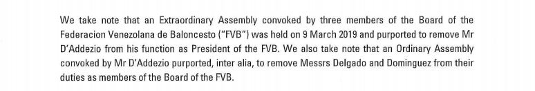 Tras advertir meses atrás por la bicefalia en la FVB y estar siguiendo de cerca su gestión económica, el máximo ente del baloncesto mundial emitió una carta a Bruno d’Addezio y Francisco Delgado como respuesta a las cartas emitidas por ambos tras las asambleas realizadas hace unos meses.