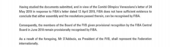 Según hemos podido conocer en Cancha Latina, la carta con la que respondió FIBA explica que las evidencias recibidas tras ambas asambleas «no tienen suficiente evidencia» y sus resoluciones «no pueden ser reconocidas por FIBA». De tal forma, FIBA mantiene el reconocimiento provisional a los miembros de la Junta Directiva y concluye que «Bruno d’Addezio será el que deba representar internacionalmente a la FVB».