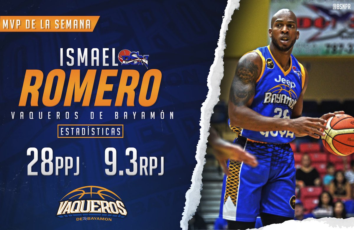 Ysmael Romero de los Vaqueros de Bayamón fue seleccionado como el Jugador Más Valioso de la la duodécima semana de acción que incluye los partidos del 20 al 26 de mayo.