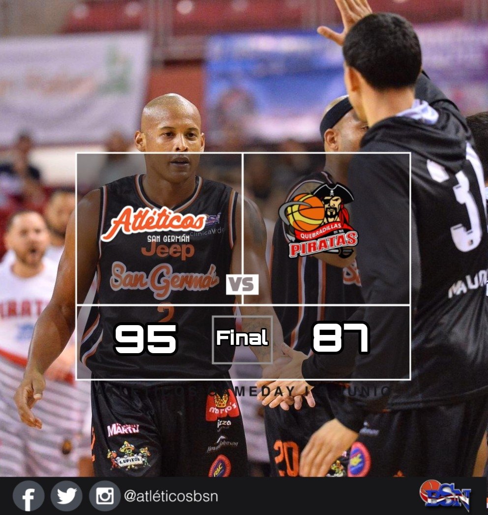 En Quebradillas, los Atléticos de San Germán derrotaron a los Piratas 95-87. Con esta victoria, San Germán sube al octavo lugar con 15-20 y terminan su temporada este martes en Ponce. La victoria en Quebradillas fue su primera en la carretera desde el pasado 23 de mayo y su cuarta en toda la temporada.