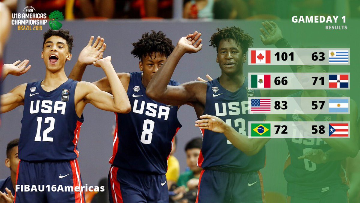 Las selecciones de Brasil, Estados Unidos, República Dominicana y Canadá, salieron victoriosas en la primera jornada del Campeonato FIBA Sub-16 de las Américas 2019 que inició este lunes en la Arena Guilherme Paraense de la ciudad de Belém, Brasil.