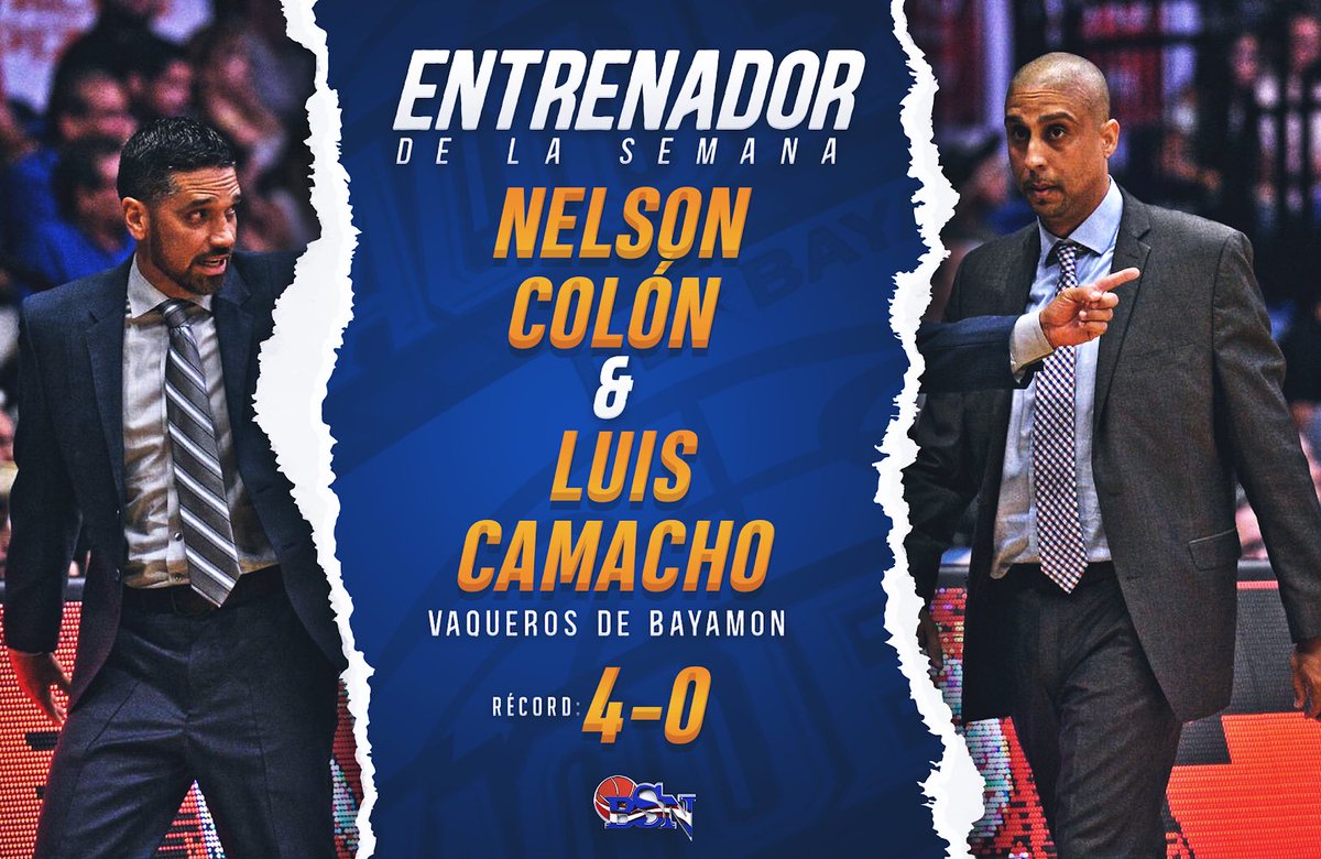 Colón y Camacho comparten el galardón de entrenador de la semana. Los técnicos de los Vaqueros de Bayamón comparten el galardón de ‘Entrenador de la Semana’ para la decimotercera semana que incluye los partidos del 27 de mayo al 2 de junio.