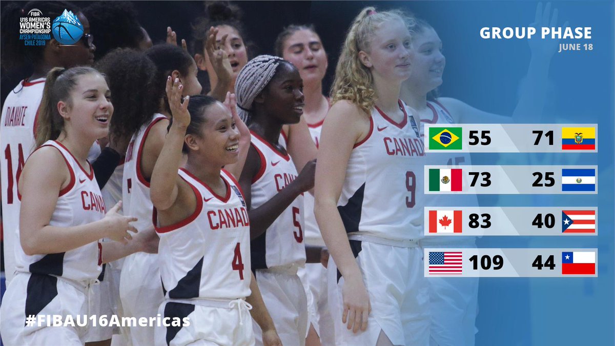 Canadá aseguró el primer lugar en el Grupo A y Estados Unidos frenó al anfitrión Chile, en el tercer día de competición en el Campeonato FIBA Sub-16 Femenino de las Américas, que se disputa en el Polideportivo 21 de abril de Aysén, Chile.