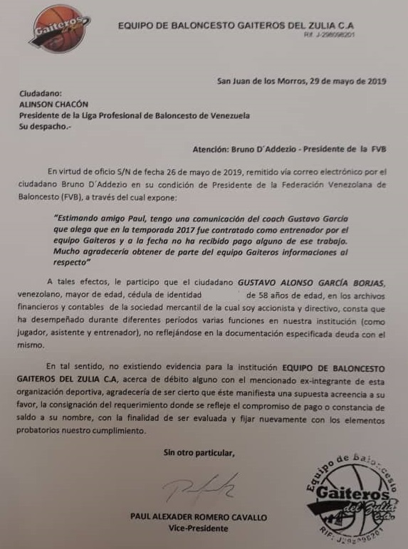 «El Presidente de la FVB les envió un oficio a Gaiteros la respuesta de Paul Romero, vicepresidente de esa organización, fue que estaban estudiando el caso ya que no se registra una deuda con el ciudadano Gustavo García. Les anexo la misiva escrita como constancia de las diligencias que se están efectuando. Aparentemente, por lo que se puede leer y como el compromiso fue verbal, pareciera que pretenden no reconocer las deudas adquiridas. Afortunadamente hay videos y constancia que laboramos en esa temporada, tampoco tienen un recibo que demuestre que ellos nos cancelaron nuestros honorarios.