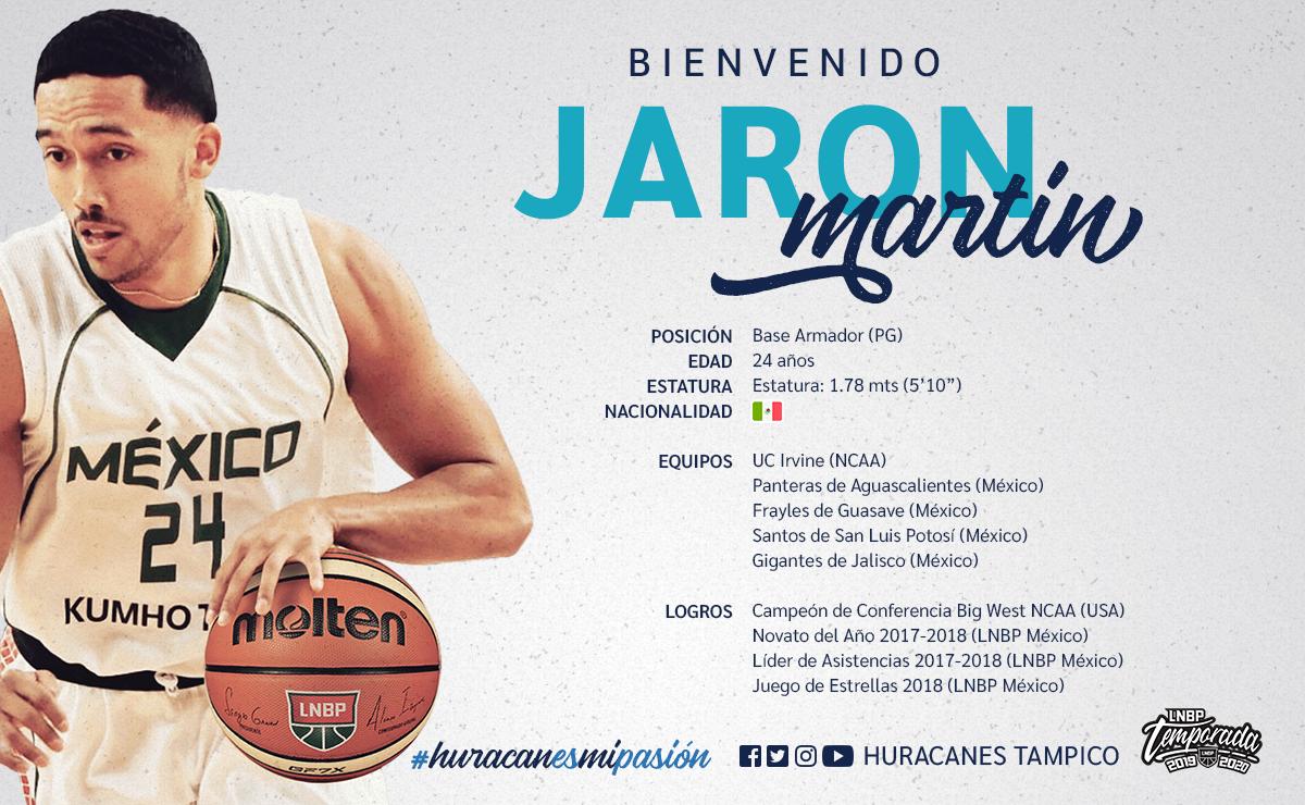 Por su parte, el base Jaron Martin (24 años y 1.78 metros) cumplirá su tercera temporada en la LNBP tras ser el Novato del Año y líder en asistencias en su año de debut con Panteras de Aguascalientes y jugar la temporada pasada con Santos de San Luis promediando 16.1 puntos, 3.0 rebotes, 6.6 asistencias, 1.5 robos y un 47.7% en triples. Además, cuenta con experiencia en la Cibacopa con Frayles de Guasave y Gigantes de Jalisco y estuvo a prueba en San Pablo Burgos en la pasada temporada.