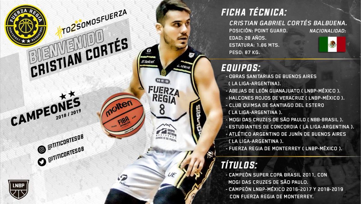 El campeón de la Liga Nacional de Baloncesto Profesional, Fuerza Regia, sigue completando su roster para la Temporada 2019/2020 en la que buscará refrendar el título. En esta ocasión se sumó un viejo conocido de la afición regiomontana, Cristian “Titi” Cortés.