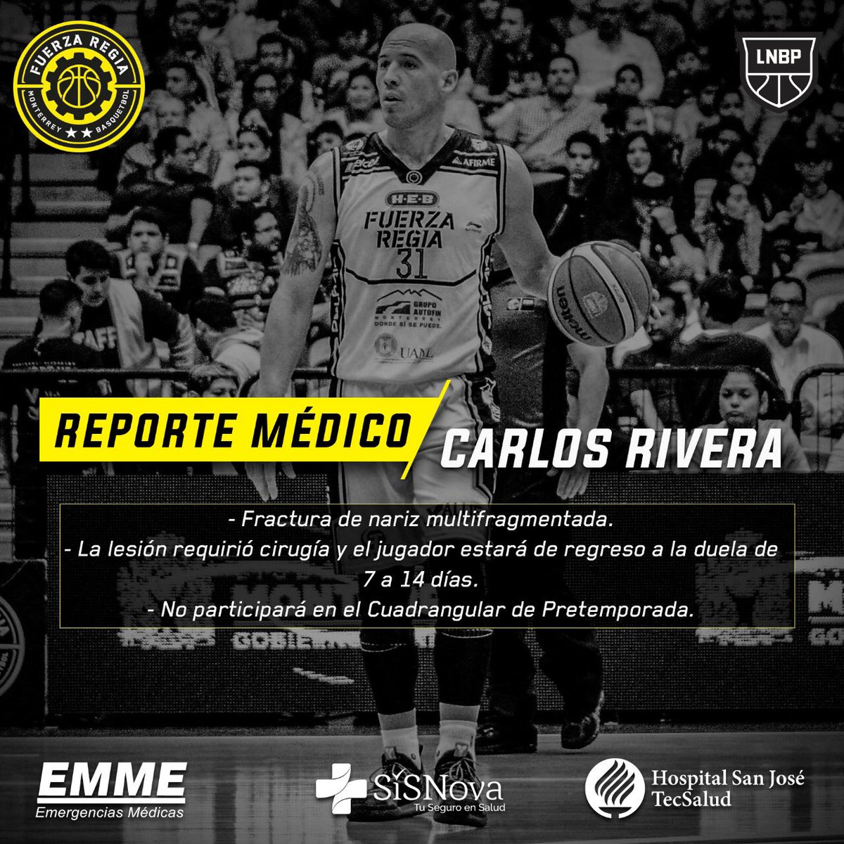 Todos los detalles de la recuperación del jugador serán notificados por el Departamento de Prensa de Fuerza Regia mediante sus boletines y redes sociales del equipo. Reporte Médico de Carlos Rivera.