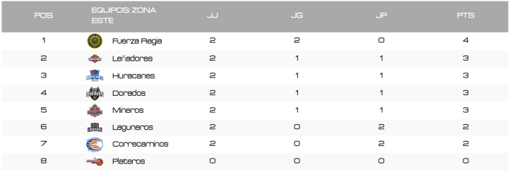 Fuerza Regia se mantiene esta jornada como líder y único equipo invicto de la Zona Este, mientras que cercana a ella se encuentran Leñadores y Huracanes con una victoria y una derrota. Plateros se encuentra al fondo de la tabla a falta de jugar su primera serie del año.