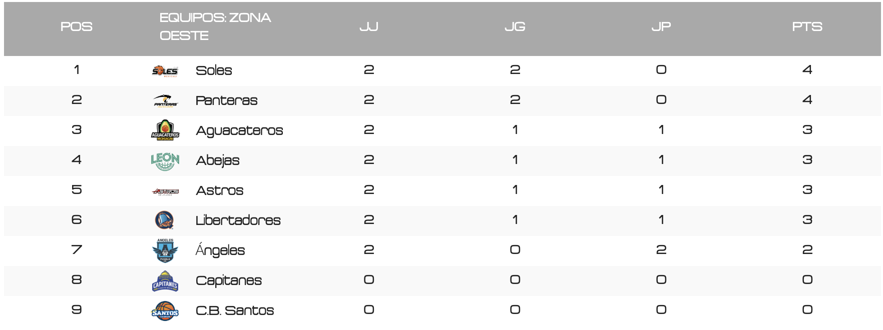 Por el costado del Oeste, Soles de Mexicali y las Panteras de Aguascalientes comparten el liderato de la zona con dos victorias por equipo. Además de Capitanes y Santos que aún no disputan sus primeros minutos en el torneo, Ángeles de Puebla es el único equipo sin triunfos en la conferencia.