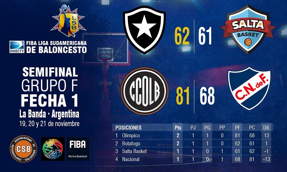 Botafogo 62 – Salta Basket 61. En un juego extremadamente parejo, el elenco brasileño prevaleció en el final gracias a un doble por tablero que venció al reloj del compromiso.