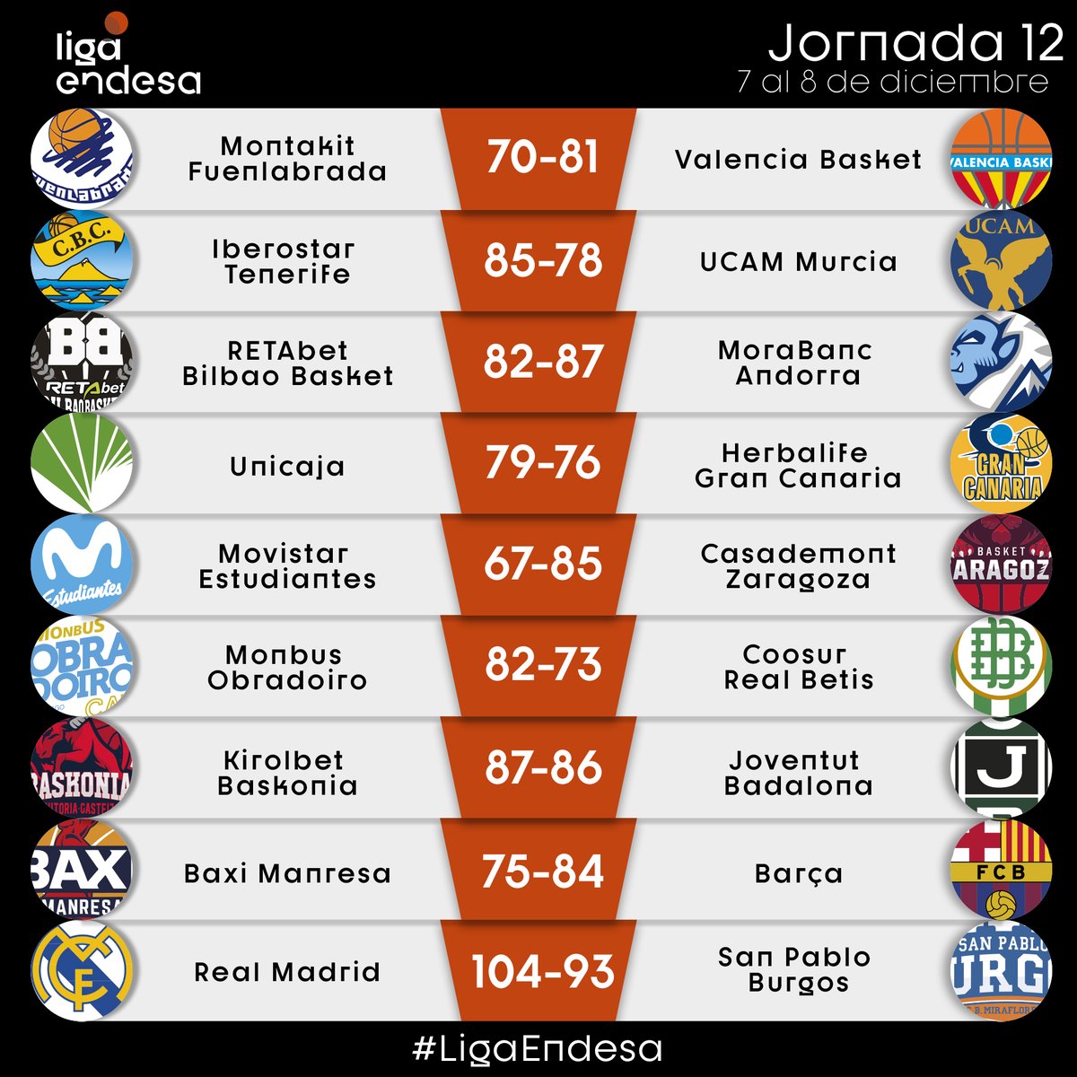 - Marcelinho Huertas: 11 puntos, 2 rebotes, 9 asistencias y 2 robos en el triunfo de Tenerife ante UCAM Murcia por 85-78