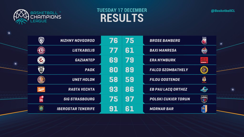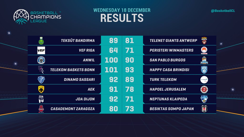Las acciones de la novena semana en la Basketball Champions League, daban comienzo este martes 17 de diciembre hasta el miércoles 18. Esta jornada marcó el regreso tras lesión del veterano dominicano Eulis Báez y el brasileño Vitor Benite. Además, la Legión latinoamericana salió a la cancha con sus 13 efectivos y sin ninguna ausencia.
