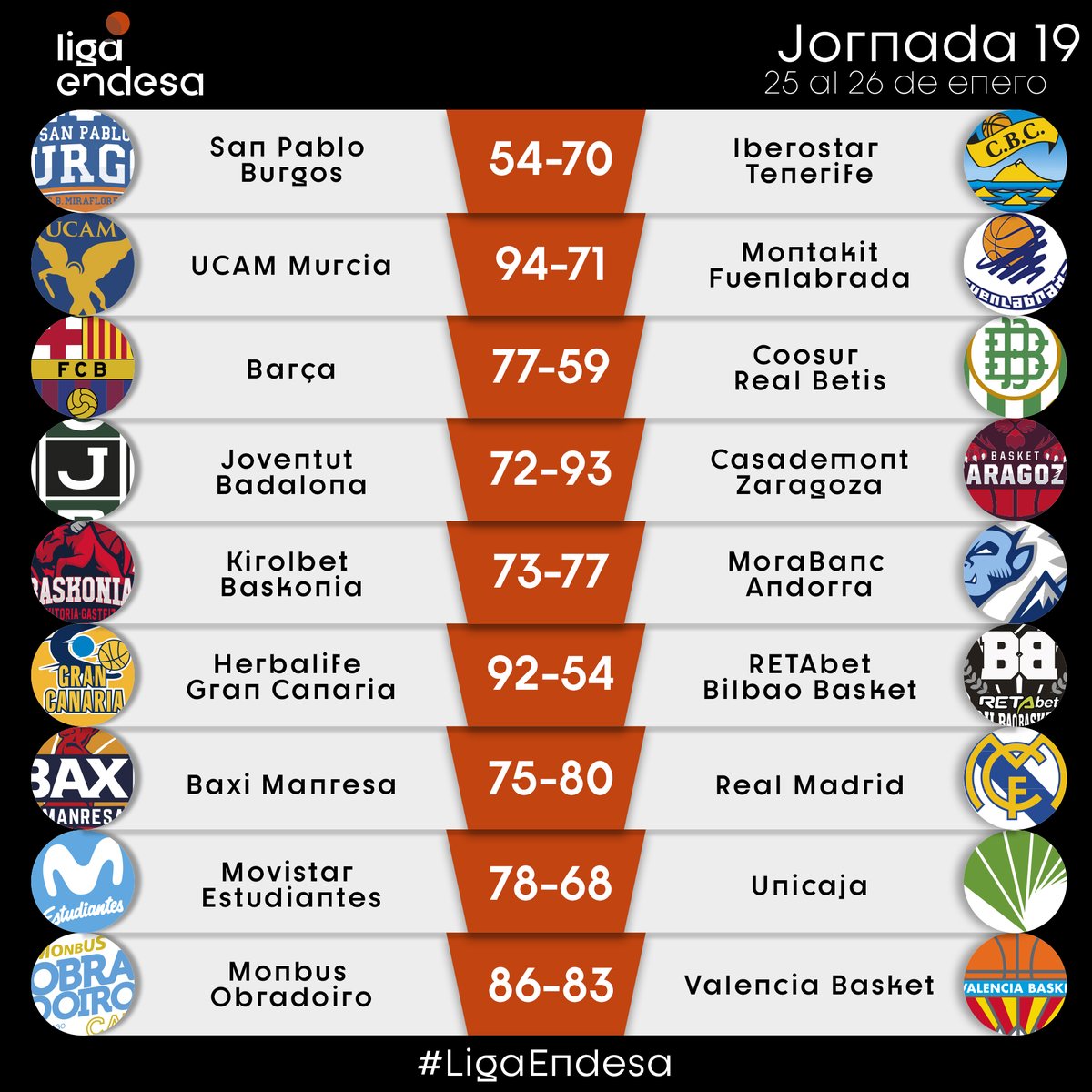 - Marcelinho Huertas: 4 puntos, 8 asistencias y 3 robos en el triunfo de Tenerife ante Burgos por 54-70