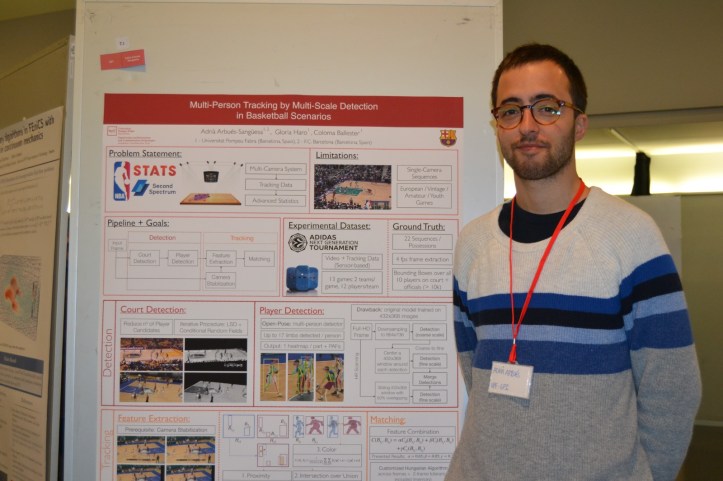 «En Estados Unidos la principal aplicación que se está utilizando es el seguimiento (tracking) de jugadores y, para ello, tiene un set de doce cámaras en el techo de los pabellones que es capaz de seguir a los jugadores con 25 muestras por segundo, que es una burrada. Aquí en Europa hay menos presupuesto, los pabellones son menos altos y esto es más difícil de implementar. En su lugar, estamos intentando replicar este sistema con una sola cámara y que ésta sea la de la retransmisión, para que no suponga un coste extra. Es bastante difícil y en mi caso hice un algoritmo de tracking que funciona con una precisión del 74% pero no es suficiente para seguir a diez jugadores»