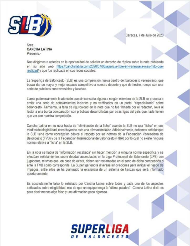 Nuestra intención siempre es trabajar a favor del baloncesto latinoamericano mediante la difusión de su actividad, como lo venimos haciendo desde hace cuatro años en esta web, y sirva como ejemplo la Superliga, de la que venimos informando desde que empezó a esbozarse este nuevo torneo, publicando las novedades en la planificación de la que será su temporada de debut, los diferentes fichajes y las notas de prensa de cada uno de los equipos participantes, así como las diferentes informaciones contrastadas que nos llegan. Por ello, siempre estamos abiertos a la réplica, puntualización o aclaración de cualquier tipo.