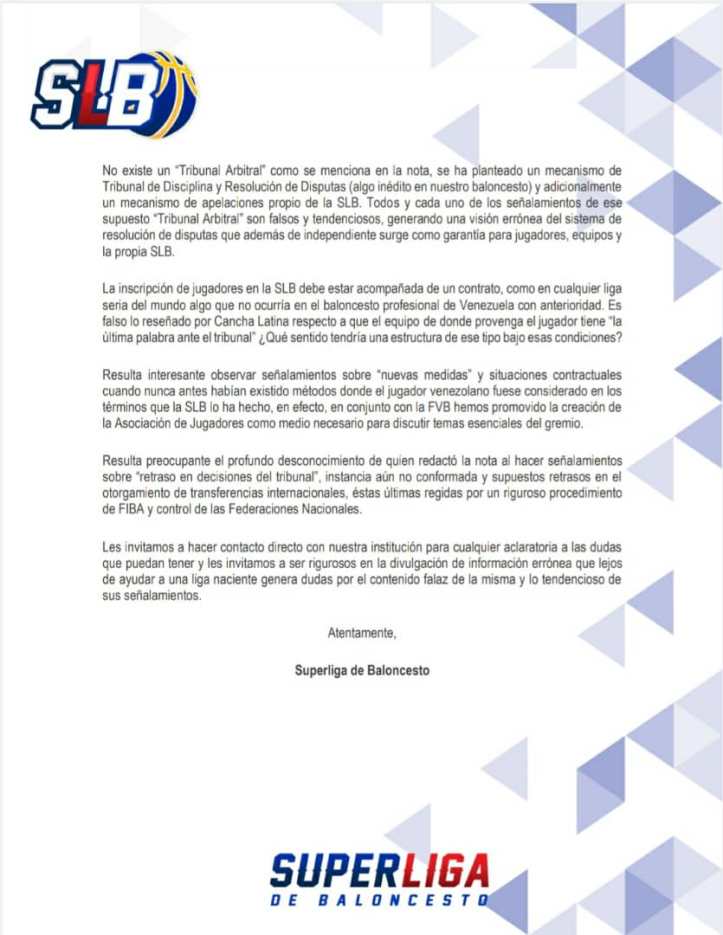 Por ello, pasamos a informar de la nota de prensa que nos envió la Superliga en respuesta a la información publicada en Cancha Latina. En ella, se aclara que la mencionada «ficha» no está entre los métodos de elegibilidad de la Superliga y que no existe ninguna norma relativa a la ficha en ella. En cuanto a temas contractuales y salariales, nos aclaran que las deudas salariales de los jugadores con equipos de la LPB se tendrán que solucionar ante esa competición o ante la FVB y que la Superliga exigirá la presentación de un contrato para inscribir un jugador, algo que «no ocurría en el baloncesto profesional de Venezuela con anterioridad»