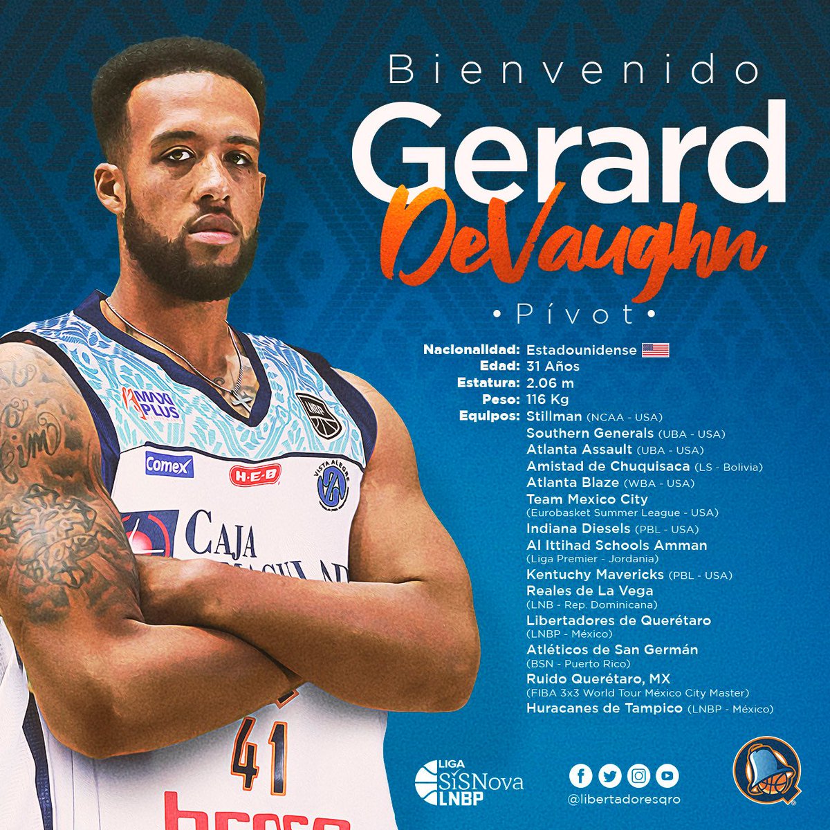 El pívot Gerard DeVaughn volverá a vestirse con el uniforme de los queretanos tras jugar la pasada temporada con Huracanes de Tampico, donde promedió 14.4 puntos, 5.6 rebotes y 1.1 asistencias y recientemente jugó con Bameso y CDP en el torneo de Santiago.
