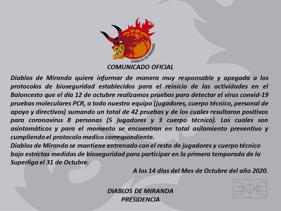 El equipo mirandino emitió un comunicado en las primeras horas del jueves informando de hasta ocho positivos asintomáticosentre jugadores y cuerpo técnico. De esta forma, Diablos suma nuevos positivos con respecto a los tests realizados en la semana pasada.