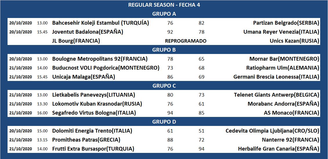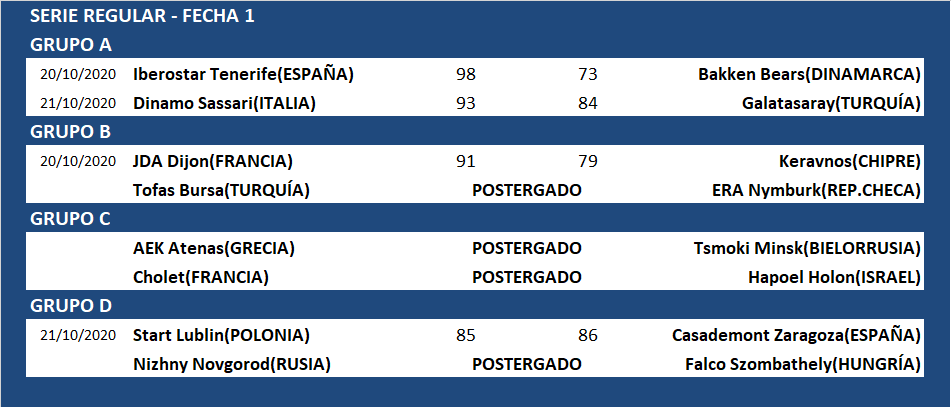 Triunfos para Zaragoza y Tenerife. El equipo aurinegro fue el encargado de abrir el torneo con un triunfo ante Bakken Bears con una exhibición de Giorgi Shermadini (26 puntos) y discretas actuaciones para Bruno Fitipaldo y Marcelinho Huertas. Por su parte, Nico Brussino sumó 21 puntos, 4 rebotes y 5 asistencias para ser uno de los bastiones de Zaragoza en su triunfo ante Start Lubin por 85-86 que decidió un triple de DJ Seeley.