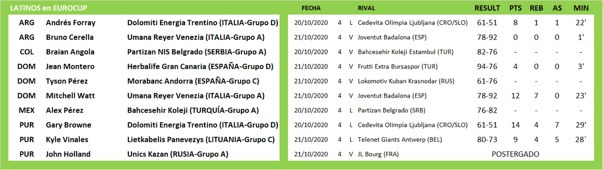Gary Browne, el mejor de los latinos en la jornada 4 de la Eurocup. El internacional por Puerto Rico volvió a ser el referente de los jugadores latinoamericanos en el segundo torneo organizado por la Euroliga. El base sumó 14 puntos, 4 rebotes y 7 asistencias en un triunfo con bajo tanteo del Trento italiano, donde el argentino Toto Forray aportó ocho puntos.