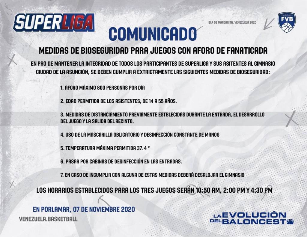 La directiva de la Superliga encabezada por su presidente Ángel Hernández informo mediante comunicado de prensa la cantidad máxima de personas que podrán ingresar al gimnasio Ciudad de la Asunción, la cuota quedo establecida en 800 personas por cada uno de los 3 cotejos, adicionalmente se informo que ingresaran al recinto deportivo aficionados entre 14 y 55 años de edad, con las medidas de distanciamiento establecidas al ingreso de cada juego.