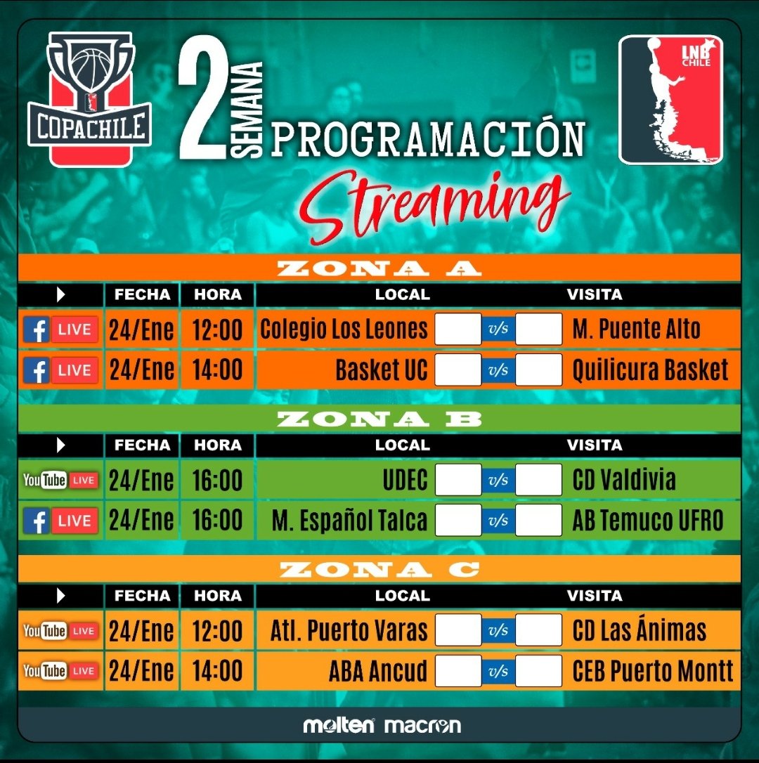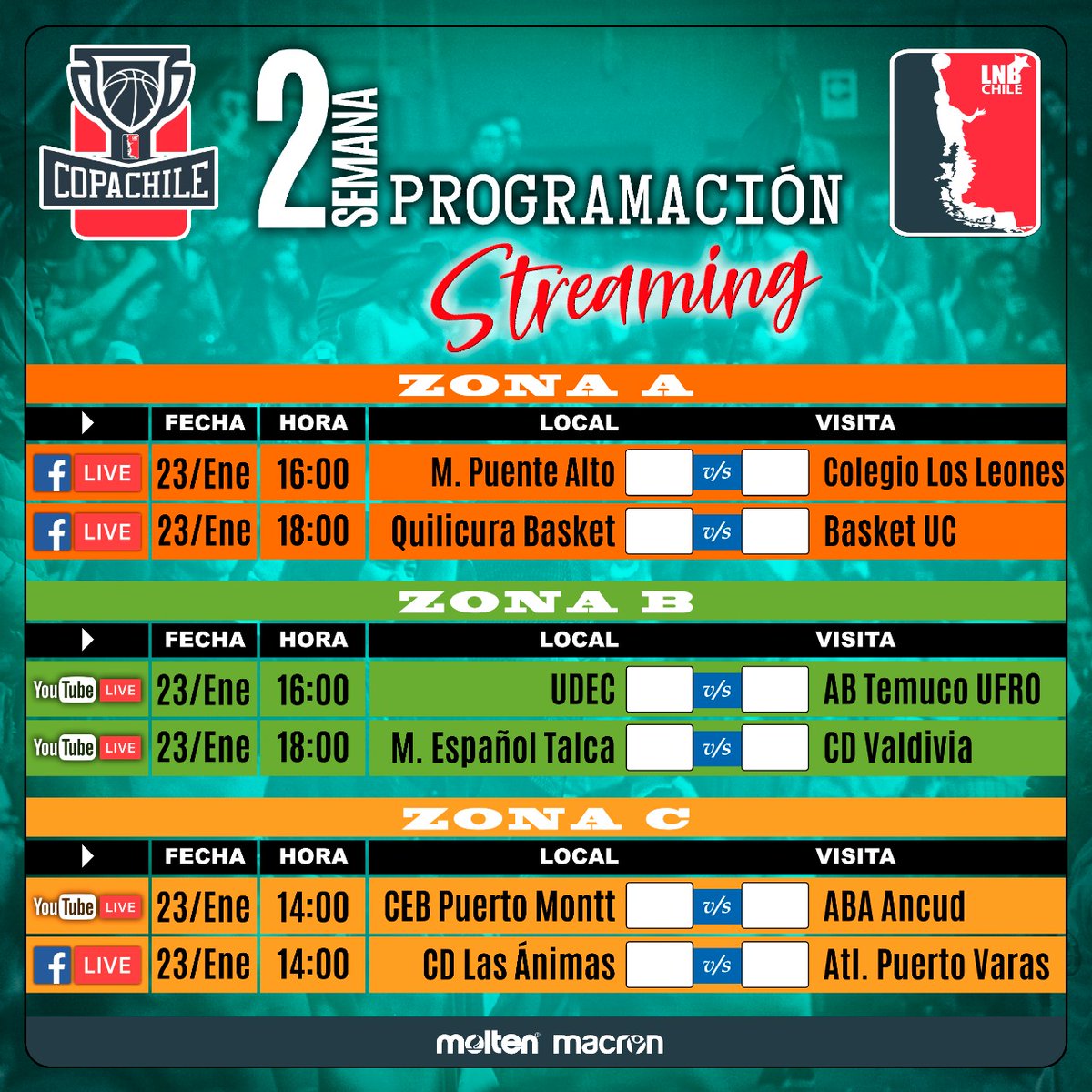El primer fin de semana de Copa Chile fue un éxito en cuanto a las transmisiones y los miles que se conectaron para seguir el retorno de LNB Chile. Este sábado 23 y domingo 24 de enero continúan los partidos, con el debut de varios equipos que no pudieron estar en la primera jornada por cumplir el protocolo Covid-19 del campeonato.