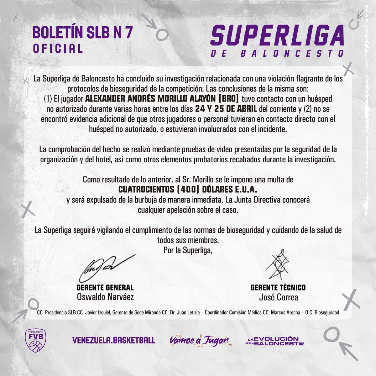 La primera reprimenda fue para Alexander Morillo, jugador de Broncos de Caracas, se saltó el protocolo de bioseguridad del torneo y será expulsado de forma inmediata de la burbuja. Según informó la Superliga, el jugador se reunió con un huésped no autorizado durante el pasado fin de semana tal y como se comprobó en las cámaras de seguridad.