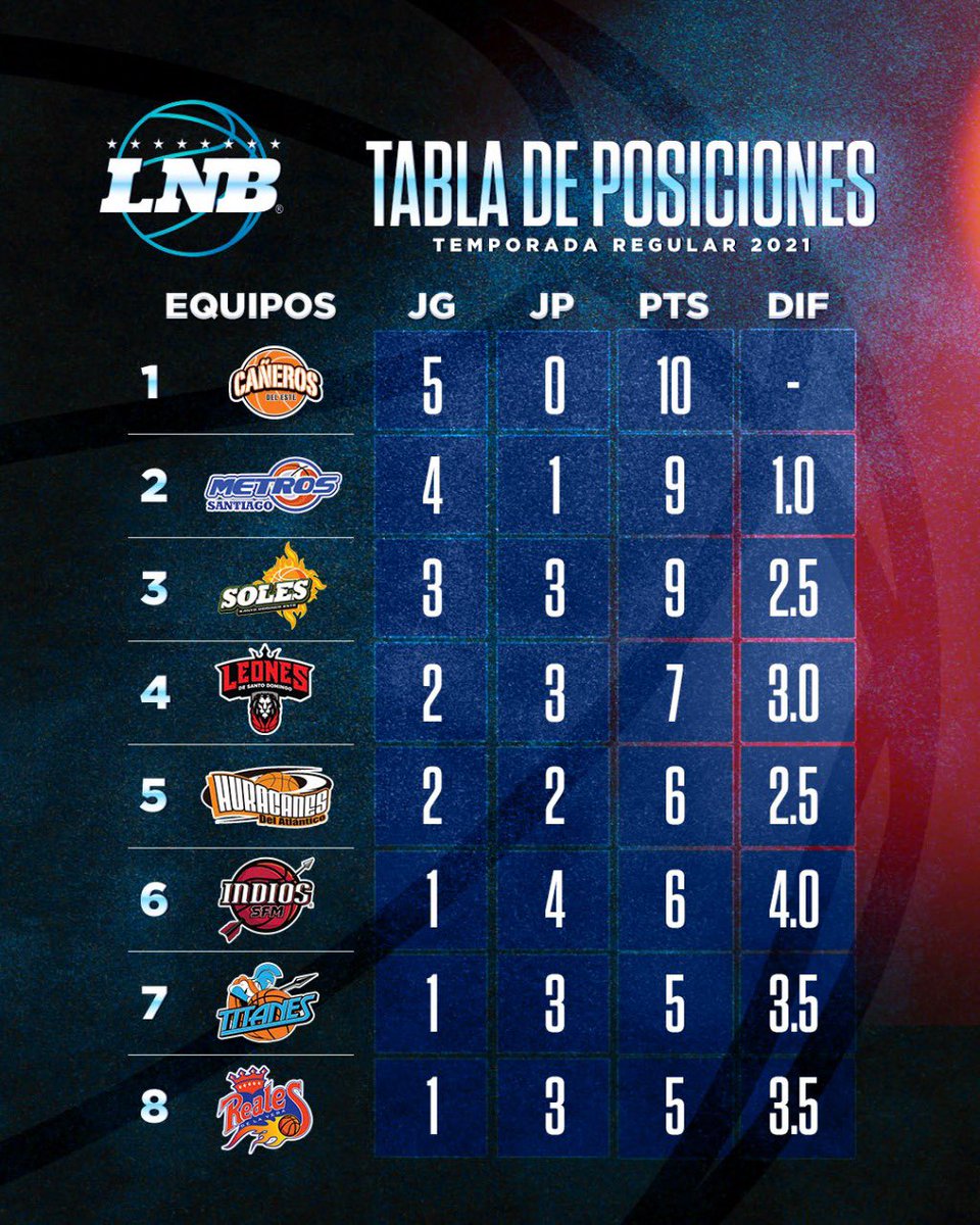 Los Cañeros del Este conservaron su invicto al derrotar 76-70 a los Leones de Santo Domingo en el partido de cierre de la doble jornada de la Liga Nacional de Baloncesto (LNB) celebrado este domingo en el Palacio de los Deportes Don Virgilio Travieso Soto. Con el triunfo, los Cañeros colocan su récord en 5-0, en tanto que los Leones tienen ahora marca de 2-3.