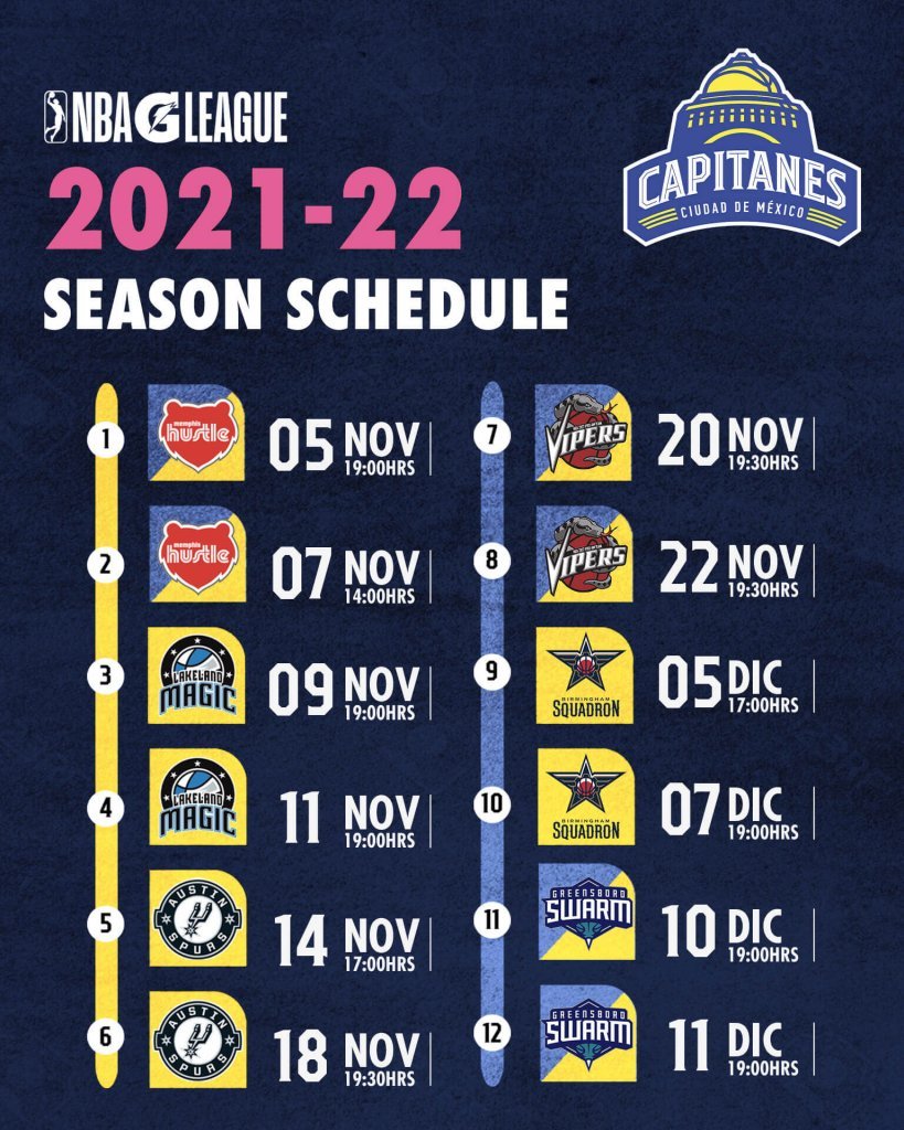 Así será el calendario. La NBA G-League anunció que Capitanes de la Ciudad de México iniciará su participación en la temporada 2021-22, el 5 de noviembre cuando se enfrente a Memphis Hustle en Landers Center a las 7pm (hora local).