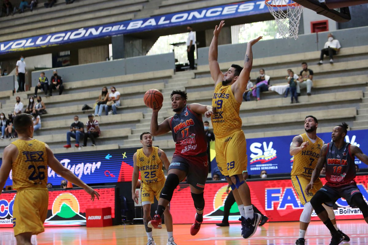 Diablos 90 – Héroes 82. El equipo mirandino sumó su segundo triunfo en un último minuto que marcó diferencias tras una paridad total y alternativas en todo el resto del partido. Un parcial de 13-6 en el minuto final con Juan Mejías y el acierto de Leinfer Montes de Oca en los tiros libres sellaron la victoria para los de Manuel Echezuría.