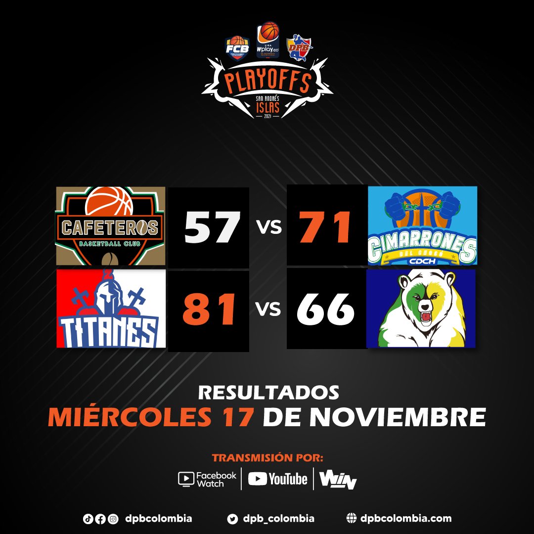 Cafeteros 57 – Cimarrones 71. Los chocoanos sorprendieron y fueron el único equipo que se impuso a un rival con mejor posición en la fase regular. Los pupilos de Jorge Carreño tuvieron el control del partido de principio a fin y se adelantan en esta serie de cuartos de final. Mateo Arboleda fue la figura ofensiva de Cafeteros con 17 puntos, 6 rebotes, 3 robos y 4/11 en triples desde la banca, mientras que el más destacado en Cimarrones fue Charles Rhodes con 20 puntos, 8 rebotes y 2/2 en triples.